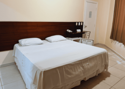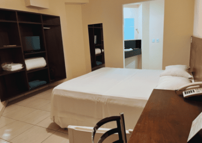 O quarto econômico tem a opção de escolha entre uma cama de casal Queen ou duas camas de solteiro (favor mandar uma mensagem com a opção desejada após a reserva). Possui banheiro privativo com chuveiro, ducha higiênica e produtos de banho grátis. Possui TV de tela plana com canais a cabo, frigobar, arara para roupas, espelho, ventilador, piso frio e vista do pátio interno. Não é permitido fumar